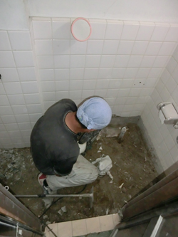 解体工事、排水配管移設、土間コンクリート(メッシュ入り)工事、タイル工事、床クッションフロアー、電源配線工事、手すり
